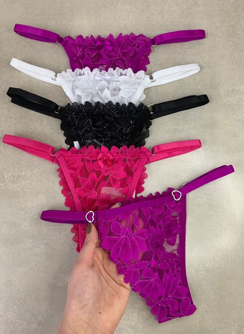 Calcinha sexy e sofisticada, confeccionada em renda delicada com toque macio e acabamento refinado. Possui regulagem nas laterais, garantindo ajuste perfeito ao corpo e conforto personalizado. O design com fio duplo valoriza as curvas de forma elegante e sensual, ideal para quem busca charme e praticidade no dia a dia ou em momentos especiais.